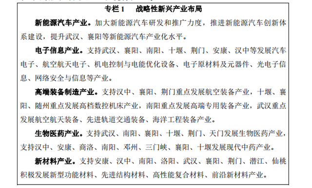 發(fā)揮武漢、襄陽、十堰、荊門、南陽、漢中等地創(chuàng)新資源優(yōu)勢, 積極培育新能源汽車、電子信息、高端裝備制造、生物醫(yī)藥、新材 料等產(chǎn)業(yè),打造一批新興產(chǎn)業(yè)基地。加強軍民融合創(chuàng)新示范,推進 軍民資源共享和軍民兩用技術雙向轉移轉化,著力推進海工裝備、 激光、北斗導航、新型航天等一批重點項目集聚發(fā)展,培育壯大一 批軍民融合領軍企業(yè)和優(yōu)勢產(chǎn)業(yè)。