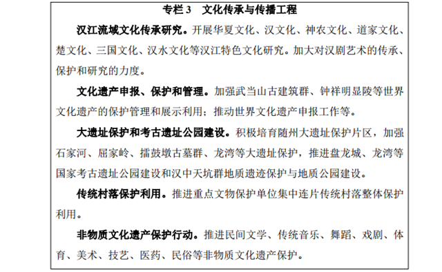 加強文化傳承與傳播。開展文化遺產(chǎn)的調查,建立漢江歷史文 化遺產(chǎn)保護傳承數(shù)據(jù)庫,做好世界文化遺產(chǎn)的申報、保護與管理, 推進大遺址保護和考古遺址公園建設,對丹江口庫區(qū)淹沒區(qū)瀕危文 物實施搶救保護。加強歷史文化名城、名鎮(zhèn)、名村的保護,有條件 的地區(qū)實行連片保護和適度開發(fā)。推進革命文物和水下文化遺產(chǎn)保 護。加強非物質文化遺產(chǎn)的挖掘與保護,深入開展傳統(tǒng)文化研究, 挖掘優(yōu)秀傳統(tǒng)文化的歷史淵源、時代內(nèi)涵和現(xiàn)實價值。聯(lián)合開展?jié)h 江文化旅游節(jié)等特色節(jié)慶活動,打造文化活動品牌。