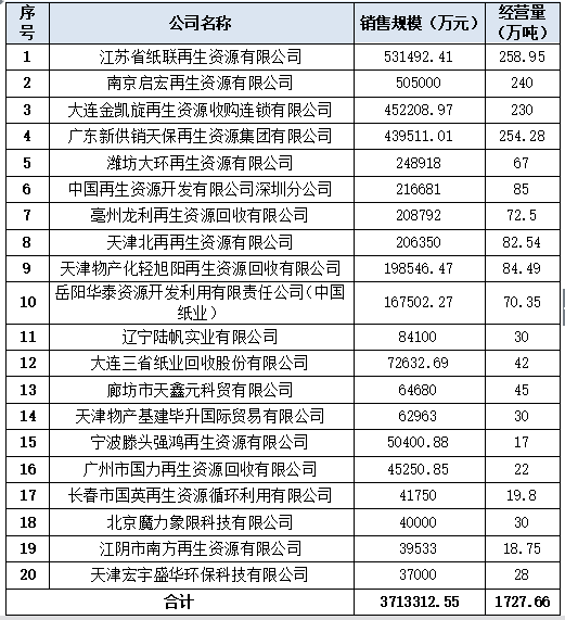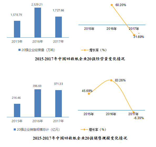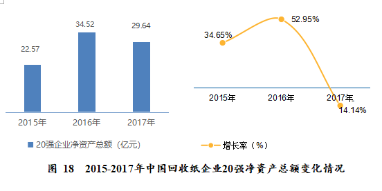 (一)2017年中國(guó)回收紙企業(yè)二十強(qiáng)的銷售規(guī)模371.33億元(2015年為216.46億元,2016年為396.69億元),較2016年同比降低了6.39%;經(jīng)營(yíng)總量1727.66萬(wàn)噸,較2016年的2529.21萬(wàn)噸減少了約800萬(wàn)噸,下降31.6%;凈資產(chǎn)總額為29.64億元,較2016年的34.52億元同比降低了14.14%,較2015年的22.57億元也有所下降。造成這種現(xiàn)象的主要原因是:一是經(jīng)營(yíng)企業(yè)對(duì)于2017年的回收紙價(jià)格波動(dòng)采取防御政策,減少了經(jīng)營(yíng)量;二是受國(guó)家環(huán)保政策不斷收緊、環(huán)保督察日趨嚴(yán)格、廢紙進(jìn)口管控政策趨嚴(yán)等因素影響,部分回收紙打包廠被迫關(guān)閉,減少了廢紙回收量;三是與《2016中國(guó)回收紙行業(yè)發(fā)展報(bào)告》相比,部分企業(yè)未進(jìn)行申報(bào),對(duì)銷售規(guī)??偤彤a(chǎn)生一定影響。