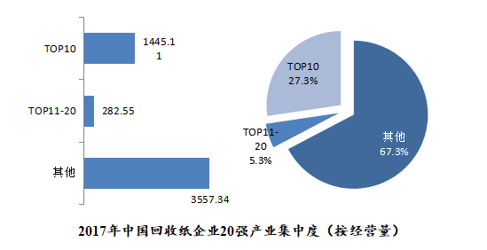 從回收紙行業(yè)二十強(qiáng)集中度看,2017年中國(guó)回收紙回收總量為5460萬(wàn)噸,二十強(qiáng)企業(yè)經(jīng)營(yíng)總量為1727.66萬(wàn)噸,占全國(guó)總量31.6%;前10強(qiáng)企業(yè)經(jīng)營(yíng)總量為1445.11萬(wàn)噸,占前二十強(qiáng)總量的83.6%,占全國(guó)總量的26.5%,產(chǎn)業(yè)集中度較高;且有7家企業(yè)連續(xù)兩年進(jìn)入前10強(qiáng),帶領(lǐng)行業(yè)發(fā)展的影響力不斷增強(qiáng)。近年受到國(guó)家環(huán)保監(jiān)督和進(jìn)口管控等因素影響,2016年二十強(qiáng)上榜的3家企業(yè)在回收、生產(chǎn)、銷售等方面受影響較大,未能在2017年保持穩(wěn)定發(fā)展,進(jìn)入前二十強(qiáng)排名,導(dǎo)致2017年的產(chǎn)業(yè)集中度相較于2016年有所下降。