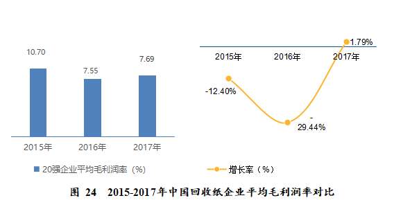 (二)2017年,中國(guó)回收紙二十強(qiáng)企業(yè)平均綜合毛利率為7.69%,較2016年的7.55%上升了0.14個(gè)百分點(diǎn),同比增長(zhǎng)1.79%;但仍低于2015年的10.70%,說(shuō)明中國(guó)回收紙企業(yè)的競(jìng)爭(zhēng)力和盈利能力與上一年基本持平,受行業(yè)整體發(fā)展趨勢(shì)影響,提升緩慢。