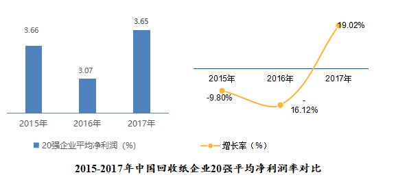 (三)2017年,中國(guó)回收紙二十強(qiáng)企業(yè)平均凈利率為3.65%,較2016年的3.07%上升了0.58個(gè)百分點(diǎn),同比增長(zhǎng)了19.02%,但是略低于2015年3.66%。結(jié)合前二十強(qiáng)企業(yè)整體經(jīng)營(yíng)情況,在2017年中國(guó)回收紙企業(yè)銷售收入總額降低的情況下,平均凈利率和平均綜合毛利率保持相對(duì)穩(wěn)定狀態(tài),說(shuō)明總體企業(yè)盈利能力有所提升,反映出兩個(gè)行業(yè)發(fā)展趨向,一是回收紙企業(yè)發(fā)展的內(nèi)生動(dòng)力開(kāi)始加強(qiáng);二是行業(yè)整個(gè)生產(chǎn)體系的內(nèi)需拉動(dòng)開(kāi)始復(fù)蘇。