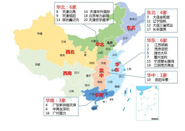 (一)從二十強(qiáng)企業(yè)的數(shù)量區(qū)域布局看,2017年中國(guó)回收紙二十強(qiáng)企業(yè)主要分布在華東和華北地區(qū),其中,華東、華北地區(qū)各有6家企業(yè)入圍前二十強(qiáng),且華東沿海地區(qū)的企業(yè)在銷售收入指標(biāo)排名都比較靠前;另外,東北地區(qū)4家,華南地區(qū)3家,華中地區(qū)1家。這種分布特點(diǎn)與經(jīng)營(yíng)量100噸/天以上單體回收紙打包廠分布趨勢(shì)相一致,說(shuō)明前二十強(qiáng)企業(yè)均重視經(jīng)營(yíng)較大規(guī)模的回收紙打包廠,并由一定數(shù)量的大型回收紙打包廠作為業(yè)務(wù)支撐,由傳統(tǒng)回收向精細(xì)化方向發(fā)展,結(jié)構(gòu)調(diào)整、優(yōu)化升級(jí)正在加快進(jìn)行。