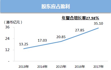 2008年至2017年,收入從19億人民幣增長至201億,利潤從3.4億增長至35億,增幅都將近十倍。最近五年收入年復(fù)合增長率39%,利潤復(fù)合增長率28%,能持續(xù)保持這種節(jié)湊往前增長的公司,香港市場并不多見。