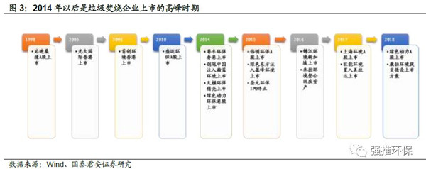 2014年及以后是我國(guó)垃圾焚燒企業(yè)上市的高峰時(shí)期。自1985年第一座垃圾焚燒廠在深圳建成,“十一五”期間垃圾焚燒行業(yè)開始發(fā)展,目前大部分項(xiàng)目是在2012年以后開始投運(yùn)。有了穩(wěn)定的運(yùn)營(yíng)業(yè)績(jī),垃圾焚燒的龍頭開始上市,除了光大國(guó)際、首創(chuàng)、北控、桑德等綜合型環(huán)保集團(tuán),2017年垃圾焚燒產(chǎn)能前22名的公司有10家是在2014年后上市或準(zhǔn)備上市。