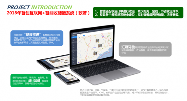 國家從2008年開始開始關注畜禽處理,2017年已經(jīng)開始形成規(guī)?;?。而匯君環(huán)能同時也從去年開始著手規(guī)劃整縣(市)資源化的處理,利用匯君模式,根據(jù)當?shù)氐膶嶋H情況,合理規(guī)劃沼氣工程中心站,另外以村鎮(zhèn)為單位、以公里半徑為單位、以養(yǎng)殖規(guī)模為單位,建立有機肥加工廠,采用智能化收儲運平臺,有效利用地方的政策,配合消納政策,實現(xiàn)全方位畜禽糞污資源化智能處理。
