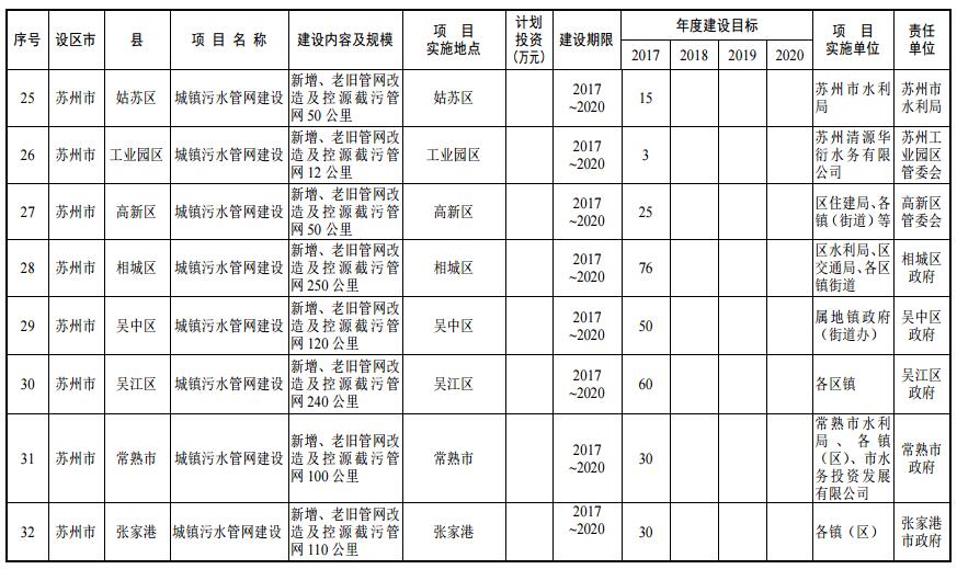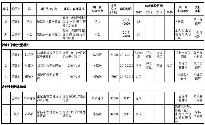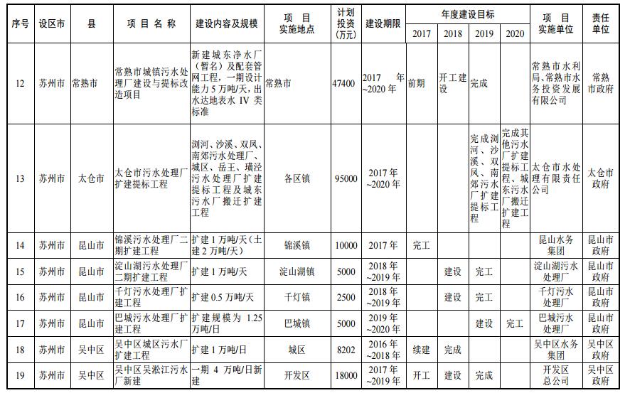 到 2020 年,蘇州市區(qū)、縣級市建成區(qū)生活污水基本實(shí)現(xiàn)全收集、全處理;全面推進(jìn)城鎮(zhèn)污水處理設(shè)施建設(shè),到 2019 年,蘇州市區(qū)、縣級市污水處理率分別達(dá)到 95%、85%。到 2020 年,蘇州市區(qū)、縣級市污水處理率分別達(dá)到 98%、90%;加強(qiáng)污泥處理處置,2017 年底前,完成現(xiàn)有城鎮(zhèn)污水處理廠污泥處理處置設(shè)施達(dá)標(biāo)改造,設(shè)區(qū)、縣級市建成城鎮(zhèn)污水處理廠污泥綜合利用或永久性處理處置。2020 年底前,縣級市實(shí)現(xiàn)永久性污泥處理處置設(shè)施全覆蓋。