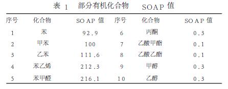 揮發(fā)性有機(jī)化合物(VolatileOrganicCompounds,簡(jiǎn)稱VOCs)一般指沸點(diǎn)低于250℃的化學(xué)物質(zhì),是最為常見(jiàn)的大氣污染物,其主要來(lái)源于化工、制藥、石油、皮革、噴涂等行業(yè)排放的有機(jī)溶劑廢氣,包含脂肪烴、鹵代烴、硫烴、芳香烴、有機(jī)酸等。這些有機(jī)廢氣不但對(duì)環(huán)境質(zhì)量、人體健康、動(dòng)植物生產(chǎn)等造成極大的直接危害,且在光氧化反應(yīng)下,易形成二次有機(jī)物氣溶膠(SecondaryOrganicAerosol,簡(jiǎn)稱SOA),導(dǎo)致光化學(xué)煙霧、酸雨、霾和氣候變化等一系列環(huán)境問(wèn)題的產(chǎn)生,這些揮發(fā)性有機(jī)廢氣在空氣中懸浮匯聚亦是導(dǎo)致PM2.5和PM10數(shù)值不斷上升的原因之一,因而如何削減這些揮發(fā)性污染物至關(guān)重要。Derwent等[1]一直致力于二次SOA的研究,他們通過(guò)二次有機(jī)氣溶膠生成潛勢(shì)(Seconda-ryOrganicAerosolPotential,簡(jiǎn)稱SOAP)研究,對(duì)多達(dá)上百種揮發(fā)性有機(jī)化合物進(jìn)行SOAP計(jì)算,具體見(jiàn)表1。
