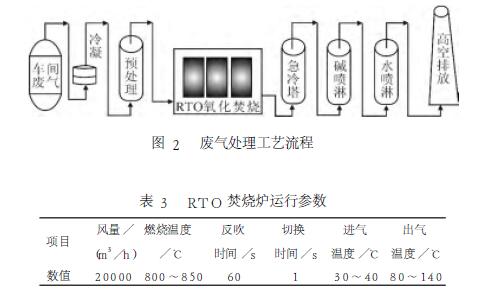 本文研究的RTO氧化焚燒裝置處理風(fēng)量設(shè)計(jì)為20000m3/h,處理工藝流程如圖2所示。廢氣經(jīng)過(guò)車間二級(jí)冷凝回收部分有機(jī)溶劑,再進(jìn)入預(yù)處理堿噴淋,吸收無(wú)機(jī)廢氣和水溶性廢氣,進(jìn)入RTO進(jìn)行氧化焚燒,先進(jìn)入急冷塔冷卻,最終通過(guò)堿、水處理后于15m高空排放。RTO焚燒爐運(yùn)行參數(shù)見(jiàn)表3