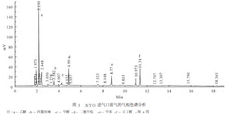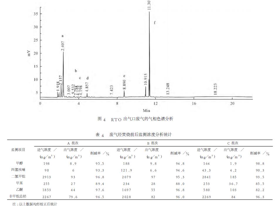以正丁醇作內(nèi)標(biāo)物,檢測(cè)廢氣中乙醚、四氫呋喃、甲醇、二氯甲烷、甲苯共5種組分含量,通過(guò)標(biāo)準(zhǔn)樣品分析,確定各個(gè)組分停留時(shí)間,結(jié)果見(jiàn)圖3和圖4。由圖可見(jiàn),對(duì)各組分出峰面積進(jìn)行校正,甲醇進(jìn)氣濃度188mg/m3,經(jīng)RTO氧化焚燒后,甲醇出氣濃度降至9.8mg/m3,削減率94.8%;四氫呋喃進(jìn)氣濃度121.9mg/m3,經(jīng)氧化焚燒后,出氣濃度降至6.6mg/m3,削減率94.6%;二氯甲烷進(jìn)氣濃度2079mg/m3,經(jīng)氧化焚燒后,出氣濃度降至97mg/m3,削減率95.3%;同樣,甲苯和乙醚削減率分別達(dá)88.0%和96.8%,且排放濃度滿足《大氣污染物綜合排放標(biāo)準(zhǔn)》(GB16297-2012)。