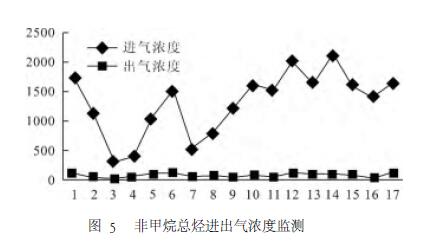 為考察RTO運(yùn)行性能穩(wěn)定性,運(yùn)行持續(xù)對(duì)該設(shè)備跟蹤研究半個(gè)多月,并將RTO進(jìn)出口非甲烷總烴監(jiān)測(cè)濃度進(jìn)行匯總,研究發(fā)現(xiàn)RTO對(duì)總有機(jī)廢氣的削減效率達(dá)95%以上,具體見(jiàn)圖5。