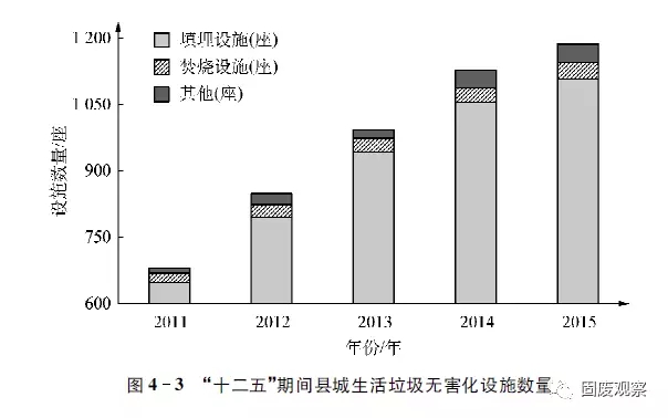 2015年全國縣級行政區(qū)域的無害化處理廠1187座,其中填埋設施1108座,比2014年新增53座,占全部縣級無害化處理設施的93.3%,從圖4-3可知,“十二五”期間縣城生活垃圾無害化處理設施建設得到快速發(fā)展。
