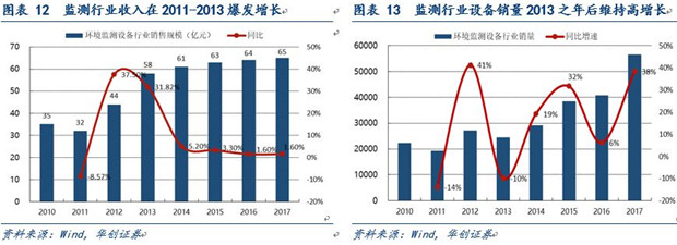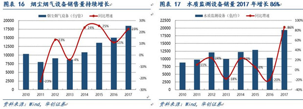 從監(jiān)測設(shè)備的細分領(lǐng)域來看,空氣質(zhì)量監(jiān)測設(shè)備歷史上經(jīng)歷了兩個高增長期,第一次爆發(fā)性增長為2011-2012年,復(fù)合增速高達197.3%,第二次出現(xiàn)在2015年,增速為161.7%,這次增長的主要原因是2016年1月1日后要實施修訂后的《中華人民共和國大氣污染防治法》,其中規(guī)定各省大氣污染防治重點任務(wù)完成情況將納入考核,刺激政府需求;此外煙塵煙氣設(shè)備行業(yè)則是從2011年開始維持穩(wěn)定的增長持續(xù)到2017年,期間復(fù)合增長率14.9%;水質(zhì)監(jiān)測設(shè)備行業(yè)發(fā)展較晚,在2017年設(shè)備銷量猛增86%,達到19345套。