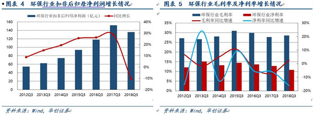 2018Q3,環(huán)保上市公司營業(yè)總收入為1369.04億元,同比增加83.37億元,增幅6.48%,增速與去年相比大幅回落。歸屬于母公司的凈利潤147.77億元,同比減少17.67億元,下降10.68%??鄢墙?jīng)常性損益后的歸母凈利潤共136.04億元,同比減少16.05億元,下降10.55%,與去年同期28.61%的增幅相比大幅下跌。行業(yè)整體毛利率為28.51%,同比增加2.62個百分點,在近幾年毛利率下滑的趨勢中有所回升,但整體凈利率為10.79%,同比減少16.12個百分點,說明毛利率的回升沒有帶來凈利率的增加。