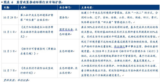 10月29日中央生態(tài)環(huán)境保護督察“回頭看”全面啟動,延續(xù)第一批環(huán)保督察“回頭看”的高壓特征,嚴(yán)監(jiān)管有利于環(huán)保需求進一步釋放。隨后11月5日《排污許可管理條例(草案征求意見稿)》的出臺也意味著環(huán)保標(biāo)準(zhǔn)提高、監(jiān)管趨嚴(yán)。而11月7日出臺的《農(nóng)業(yè)農(nóng)村污染防治攻堅戰(zhàn)行動計劃》中提出到2020年要實現(xiàn)“一保兩治三減四提升”的總目標(biāo),進一步釋放環(huán)保行業(yè)的市場空間。