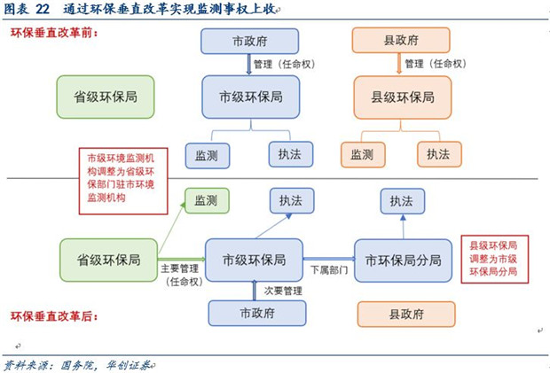 通過環(huán)保監(jiān)測垂直改革將環(huán)境監(jiān)測事權(quán)上收。2016年9月環(huán)保部印發(fā)《關(guān)于省以下環(huán)保機構(gòu)監(jiān)測監(jiān)察執(zhí)法垂直管理制度改革試點工作的指導(dǎo)意見》,調(diào)整地方環(huán)境保護管理體制重新劃定各省市縣的監(jiān)管力量和監(jiān)管責(zé)任,涉及體制結(jié)構(gòu)、經(jīng)費保障、人員劃轉(zhuǎn)等多個方面。通過垂直管理制度改革實現(xiàn)環(huán)境監(jiān)測事權(quán)的上收要求:體制上,省級環(huán)保部門直接管理市級環(huán)境監(jiān)測機構(gòu),確保生態(tài)環(huán)境質(zhì)量監(jiān)測數(shù)據(jù)真實有效;市級統(tǒng)一管理行政區(qū)域內(nèi)的環(huán)境執(zhí)法力量,依法獨立行使環(huán)境執(zhí)法權(quán)。保障上,駐市級環(huán)境監(jiān)測機構(gòu)的人財物管理在省級,縣級環(huán)保部門的人財物管理在市級。人員管理上,縣級環(huán)保分局領(lǐng)導(dǎo)班子由市級環(huán)保局直接管理,市級環(huán)保局領(lǐng)導(dǎo)班子由省級環(huán)保廳(局)主管。因而能夠有效的克服地方保護主義,從根源上解決監(jiān)測數(shù)據(jù)造假的問題,提升監(jiān)測數(shù)據(jù)有效性。