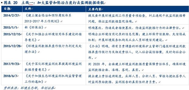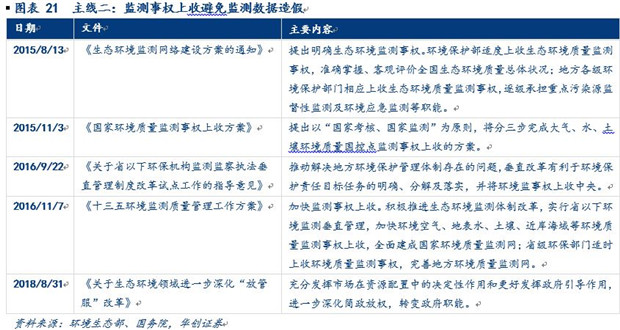 第三階段:政策推動集中打擊監(jiān)測數(shù)據(jù)造假。2015年以來,整體上監(jiān)測設(shè)備廣泛布局和補充升級的過程已經(jīng)基本結(jié)束,后續(xù)增長有限,實施執(zhí)行過程中暴露出篡改、虛報數(shù)據(jù)等諸多問題才是該階段的主要問題,因而規(guī)范監(jiān)測數(shù)據(jù)、打擊數(shù)據(jù)造假成為本階段主題。從政策來看,打擊數(shù)據(jù)造假的執(zhí)行過程中有兩條主線:第一條主線貫穿始終,從2015年1月1日《新環(huán)保法》頒布以來,又陸續(xù)出臺實施指導(dǎo)意見通過明確責(zé)任、建立懲罰機制加大監(jiān)測數(shù)據(jù)造假的成本,用嚴(yán)監(jiān)管的方式打擊監(jiān)測數(shù)據(jù)造假;第二條主線則是對主線一的補充和優(yōu)化,從2015年8月開始,通過監(jiān)測事權(quán)上收、調(diào)整監(jiān)管體系架構(gòu),從根源上用疏通的方式來避免監(jiān)測數(shù)據(jù)造假的問題。