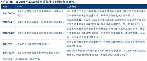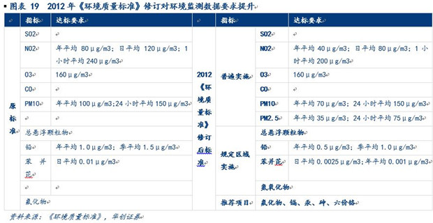 對監(jiān)測數(shù)據(jù)要求提升從政策看來主要表現(xiàn)在兩個方面:(1)擴大監(jiān)測指標(biāo)范圍+縮緊合格要求。早在2012 年環(huán)保部頒布新版《環(huán)境空氣質(zhì)量標(biāo)準(zhǔn)》中普遍實施的指標(biāo)中新增PM2.5,部分區(qū)域?qū)嵤┑闹笜?biāo)中新增了氮氧化物,并新增推薦項目鎘、汞、砷、六價鉻,擴大了環(huán)境監(jiān)測數(shù)據(jù)的覆蓋范圍;同時對NO2、PM10、鉛、苯并芘等已有監(jiān)測指標(biāo)的合格要求也變得更加嚴(yán)格。而該標(biāo)準(zhǔn)的實施細則在2013年3月頒布并廣泛實行。2014年又進一步出臺對大氣和石化行業(yè)的細分要求,提高對排放限值的規(guī)定。(2)管理+采集雙管齊下提升數(shù)據(jù)真實性。自2012年出臺的《關(guān)于加強環(huán)境空氣質(zhì)量監(jiān)測能力建設(shè)的意見》開始提出要通過健全審核機制、提高公布數(shù)據(jù)的頻率等管理手段來加強環(huán)境監(jiān)測數(shù)據(jù)的有效性,提出共享數(shù)據(jù)的概念,并制定“三步走”的執(zhí)行方案,系列政策一直持續(xù)到2013年底。