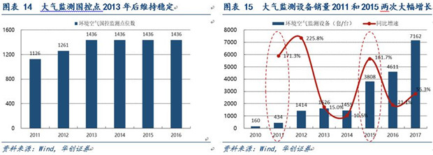 第一階段:建設(shè)監(jiān)測體系,國控點、省控點等大型監(jiān)測設(shè)備廣泛布局。第一階段從2011年開始到2013年結(jié)束,首先這是環(huán)境監(jiān)測行業(yè)在各省市普及化布局監(jiān)測點位,集中發(fā)展的重要階段。從監(jiān)測行業(yè)營收來看,行業(yè)銷售規(guī)模從32億元猛增到58億元,兩年內(nèi)的同比增速在30%以上,復(fù)合增速高達34.6%,而期間監(jiān)測設(shè)備銷量的增長率為12.8%,該階段主要由于采購的主要為大型監(jiān)測站,價值量較高,所以營收增速高于設(shè)備銷售增速;隨著2013年大型監(jiān)測站基本布局完成,大氣監(jiān)測國控點的數(shù)目基本穩(wěn)定在1436個,此后監(jiān)測設(shè)備銷售主要用于補充配置,銷量增速高于行業(yè)營收增速。
