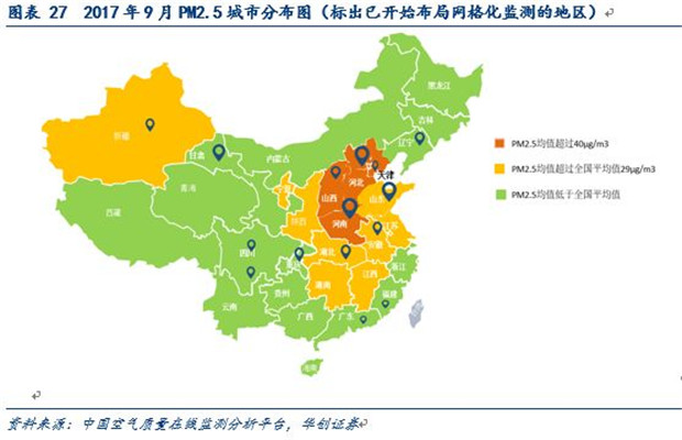 對各省份污染程度的劃分則依據(jù)2017年9月空氣監(jiān)測的PM2.5的數(shù)據(jù),劃分重度污染為PM2.5均值超過40微克的省份/直轄市,包括、河南、河北、山西、天津、北京;中度污染為PM2.5超過全國均值的省份,包括山東、江西、湖南、安徽、陜西、江蘇、新疆、湖北、寧夏;輕度污染為PM2.5低于全國均值的省份,包括廣東、遼寧、廣西、上海、浙江、福建、四川、重慶、內(nèi)蒙古、甘肅、貴州、青海、吉林、黑龍江、云南、西藏、海南。