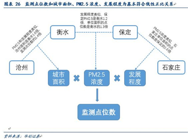 從布點的個數(shù)來看,污染嚴(yán)重、面積大、經(jīng)濟發(fā)達的地級市布點更為密集。以河北為例,滄州市和衡水市的污染程度差不多,同作為非省會的地級市發(fā)展程度也類似,而滄州市的面積是衡水的1.6倍,而滄州的監(jiān)測點位數(shù)為衡水的近1.4倍,所以可以認(rèn)為布點個數(shù)和面積基本為線性正比;而比較保定市和衡水市,保定市是衡水市面積的2.5倍,發(fā)展程度相似,但折算后的單位面積的點位數(shù)保定仍是衡水的1.3倍,這是因為保定的PM2.5濃度是衡水的1.2倍,所以可以認(rèn)為監(jiān)測點位數(shù)和PM2.5濃度基本符合線性正比關(guān)系;而對于保定和石家莊,兩者的污染程度類似,保定市的面積是石家莊的1.6倍,但布局的監(jiān)測點位數(shù)差不多,可以發(fā)現(xiàn)經(jīng)濟發(fā)達地區(qū)/省會城市的網(wǎng)格化監(jiān)測點位數(shù)會存在一個放大倍數(shù)。