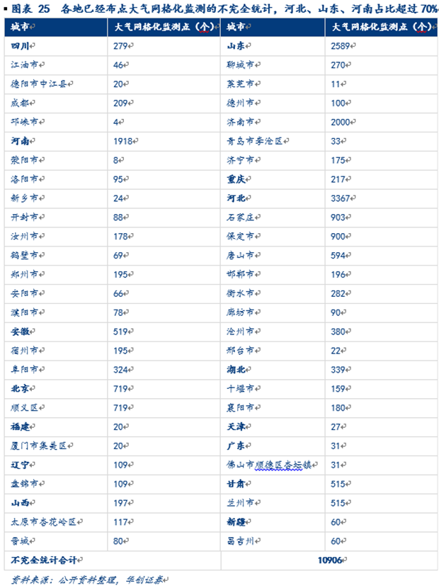 2017 年以來我國大氣網(wǎng)格化監(jiān)測訂單總額超過7億元,招標(biāo)主體涉及河北、河南、山東、陜西、天津、福建、廣東、廣西、安徽、四川、江蘇、甘肅、湖北、新疆與遼寧這 15 個省級行政區(qū),39個地級市。經(jīng)不完全統(tǒng)計全國大氣網(wǎng)格化監(jiān)測布點10906個,其中河北、山東、河南布點數(shù)目全國前三,涉及23個城市,合計7874個點位,占全國總布點數(shù)目70%以上。而且三大省份已經(jīng)布局的這23個城市中有18個都屬于《京津冀及周邊地區(qū)2017年大氣污染防治工作方案》中明確的“2+26”通道城市,其中河北省的8個通道城市,石家莊、唐山、廊坊、保定、滄州、衡水、邢臺、邯鄲全部實現(xiàn)網(wǎng)格化監(jiān)測覆蓋;山東省的7個通道城市中,濟南、濟寧、德州、聊城已經(jīng)布點并統(tǒng)計在內(nèi),淄博已經(jīng)完成布點但沒有準(zhǔn)確數(shù)據(jù),濱州和菏澤在尚布局中;河南省的7個通道城市中,鄭州、開封、安陽、鶴壁、新鄉(xiāng)、濮陽已經(jīng)完成布點,只有焦作尚在布局中。外加北京、天津、山西省的太原和晉城也完成網(wǎng)格監(jiān)測點布局,“2+26”城市中有22個已經(jīng)布點,基本實現(xiàn)了城市的覆蓋,但從布點數(shù)量來看河北廊坊市、山東濟寧市、聊城市、河南省各市以及天津只是剛剛開始,這些城市離布局完成還有近80%的空間。