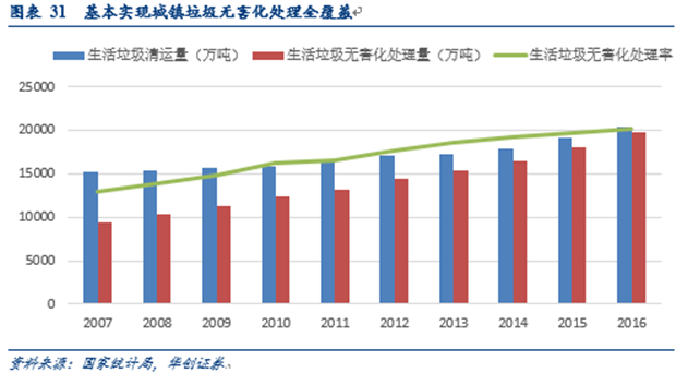 就當(dāng)前而言,我國城鎮(zhèn)垃圾無害化處理率超過95%,絕對量持續(xù)增長。2016年,我國2.03億噸城市垃圾清運量中,無害化處理1.97億噸,占比96%,無害處處理率同比提升1個點。預(yù)期未來城市垃圾無害化處理率將繼續(xù)維持在高水平。
