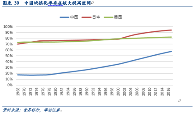 對比發(fā)達國家,我國城鎮(zhèn)化率仍有較大的差距。2017年,我國城鎮(zhèn)化率僅為58.52%,與發(fā)達國家普遍80%以上的城鎮(zhèn)化率相比,提高空間較大。