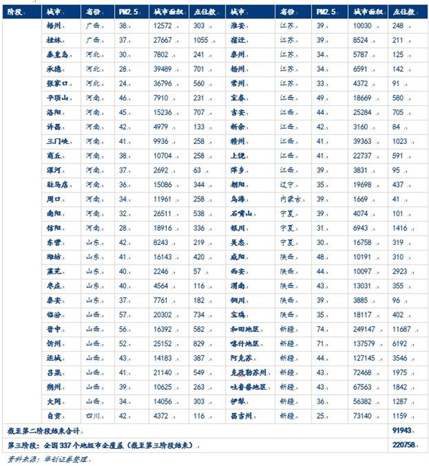 第二階段是全國重點污染城市覆蓋階段,覆蓋①重度污染省份的所有地級市②中度污染省份中污染程度前50%的所有地級市③所有PM2.5(從大到?。┡琶耙话俚某鞘?;