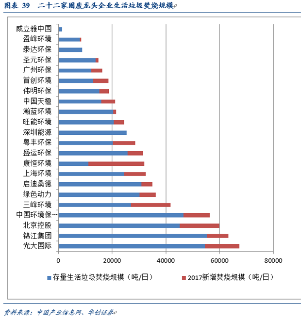 從處理能力來看,行業(yè)整體較為分散,但增速較快,2017 年二十二家固廢龍頭企業(yè)新增生活垃圾焚燒總規(guī)模 119421噸/日,增速約23%。