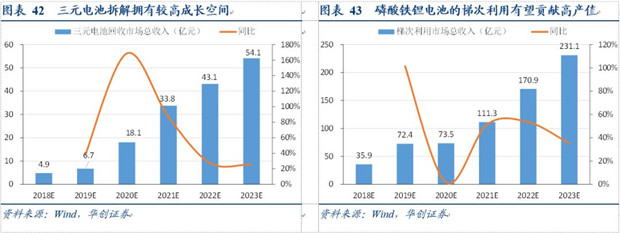 而從產(chǎn)值來看,三元電池回收企業(yè)主要以拆解提純正極材料再出售為主要業(yè)務(wù),而磷酸鐵鋰電池則主要應(yīng)用于梯次利用。根據(jù)未來動力電池回收量,我們預(yù)計動力電池兩種回收形態(tài)有望在2020-2021年擁有超百億的市場空間,且未來仍有望保持較高增長。