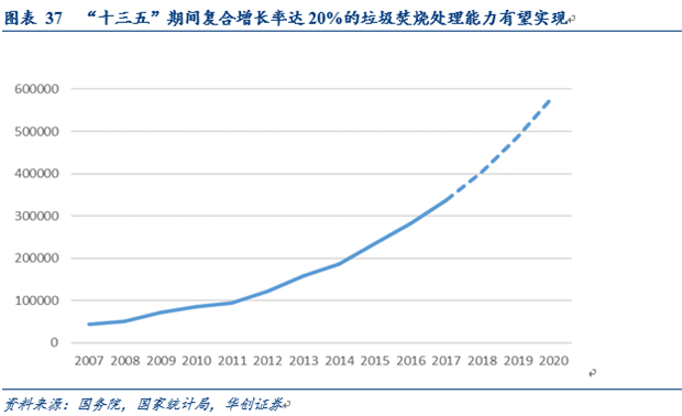 根據(jù)《“十三五”全國城鎮(zhèn)生活垃圾無害化處理設(shè)施建設(shè)規(guī)劃》,到2020年底全國城鎮(zhèn)生活垃圾焚燒處理設(shè)施能力占無害化處理總能力50%以上,其中東部地區(qū)占60%以上。2016年底,我國城市垃圾焚燒處理能力為25萬噸/日,而根據(jù)規(guī)劃2020年垃圾焚燒處理能力須達到59萬噸/日,為達到這一目標(biāo),“十三五”期間,生活垃圾焚燒處理能力年復(fù)合增長率最低須達到20%的增速。