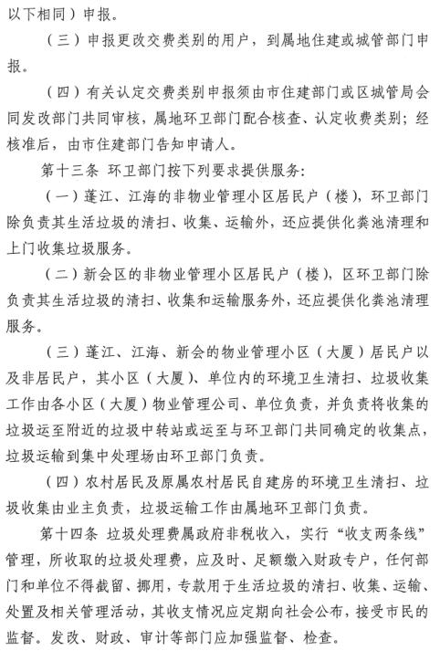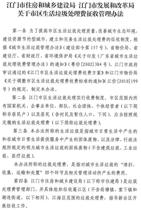 日前, 廣東江門市住建局發(fā)布了關(guān)于征求對《關(guān)于市區(qū)生活垃圾處理費(fèi)征收管理辦法》修訂意見的公告,詳情如下: