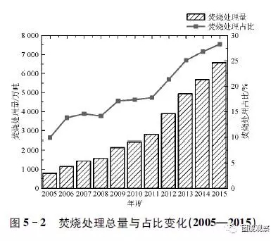 十二五期間,垃圾焚燒行業(yè)在我國(guó)迎來(lái)了高速發(fā)展的五年,從國(guó)家到地方發(fā)布多項(xiàng)利好政策予以規(guī)范和扶持,垃圾焚燒行業(yè)發(fā)展增速驚人。截止到2015年底,我國(guó)(含設(shè)市城市與縣城)共建成生活垃圾焚燒設(shè)施257座,設(shè)施占比12.4%,總處理能力235224噸/日,占無(wú)害化處理能力的31.0%;年焚燒垃圾6577.0萬(wàn)噸,占無(wú)害化處理總量的28.3%。與2014年相比,在焚燒設(shè)施、焚燒處理能力和焚燒處理量上分別同比增長(zhǎng)15.8%、17.3%和15.9%,在設(shè)施數(shù)量占比、設(shè)施能力占比和處理量占比方面分別增加了1.0、2.4和1.5個(gè)百分點(diǎn)。全國(guó)人均焚燒量也從期初(2011年)的0.139公斤/人·天,躍升至期末的0.292公斤/人·天,同比增長(zhǎng)110.1%,上升發(fā)展態(tài)勢(shì)明朗。