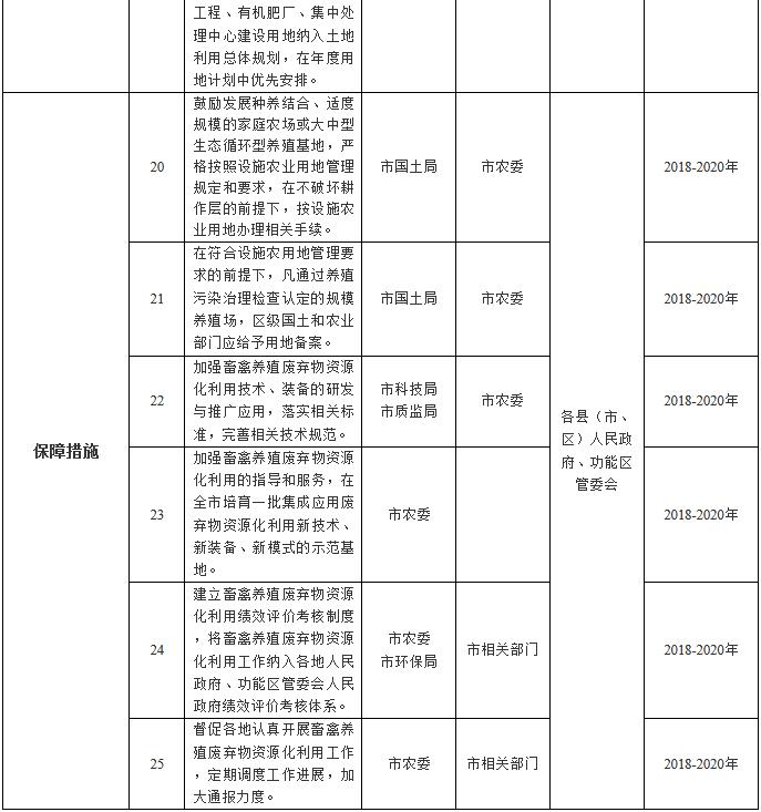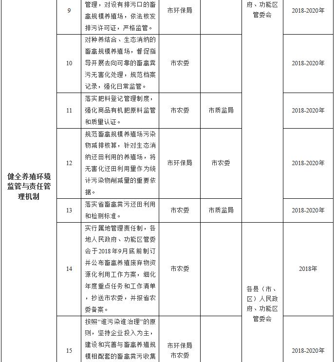 (九)堅持屬地責(zé)任管理。畜禽養(yǎng)殖廢棄物資源化利用實行屬地管理責(zé)任制,各地人民政府、功能區(qū)管委會對本行政區(qū)域內(nèi)的畜禽養(yǎng)殖廢棄物資源化利用工作負(fù)總責(zé),強化組織領(lǐng)導(dǎo),明確部門職責(zé),建立協(xié)調(diào)機制,加強政策扶持,強化日常監(jiān)管,健全督查制度和巡查機制,確保各項任務(wù)落實到位。堅持保供給與保生態(tài)并重,落實“菜籃子”市長負(fù)責(zé)制,統(tǒng)籌環(huán)境保護(hù)與畜牧業(yè)協(xié)調(diào)發(fā)展。各縣(市、區(qū))人民政府、功能區(qū)管委會應(yīng)于2018年10月底前制訂并公布畜禽養(yǎng)殖廢棄物資源化利用工作方案,細(xì)化年度重點任務(wù)和工作清單,抄送市農(nóng)委,并報省農(nóng)委備案。