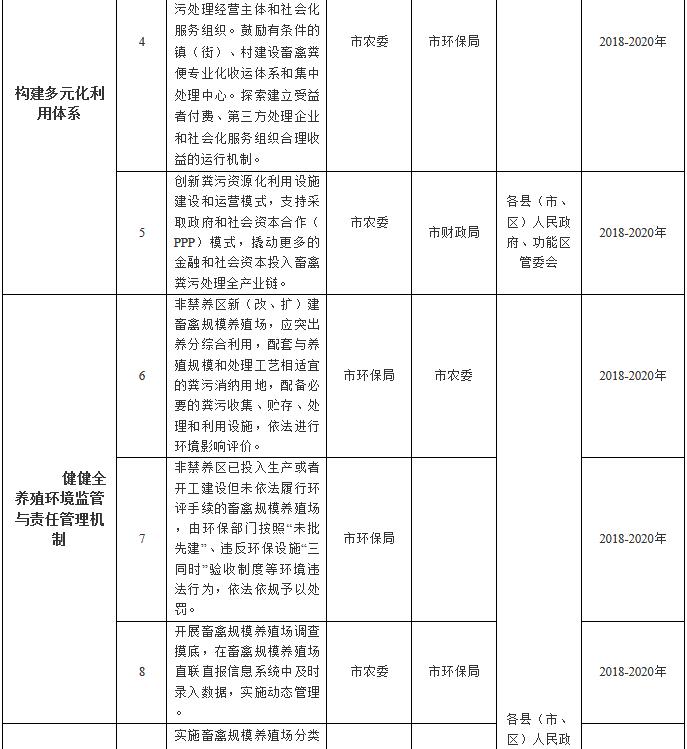 (二)主要目標(biāo)。到2019年,大型規(guī)模養(yǎng)殖場糞污處理設(shè)施裝備配套率達(dá)到100%;到2020年,建立科學(xué)規(guī)范、權(quán)責(zé)清晰、約束有力的畜禽養(yǎng)殖廢棄物資源化利用體系,構(gòu)建種養(yǎng)循環(huán)發(fā)展機制,全市畜禽糞污綜合利用率達(dá)到78%以上,規(guī)模養(yǎng)殖場糞污處理設(shè)施裝備配套率達(dá)到96%以上,規(guī)模養(yǎng)殖場治理率達(dá)到90%以上。