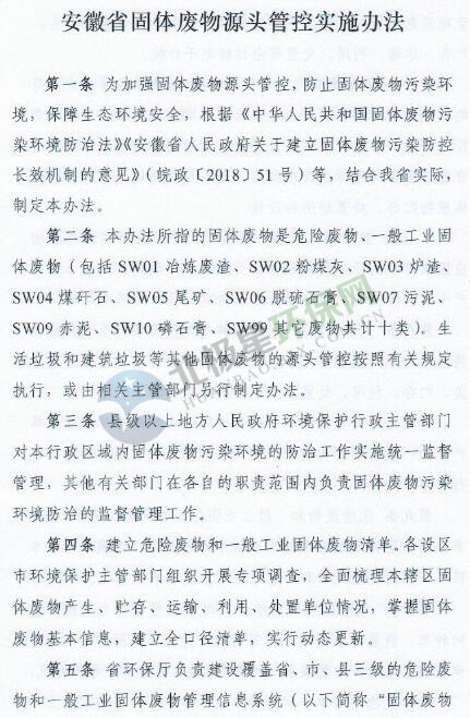 日前,安徽省發(fā)布《安徽省固體廢物源頭管控實(shí)施辦法》,詳情如下: