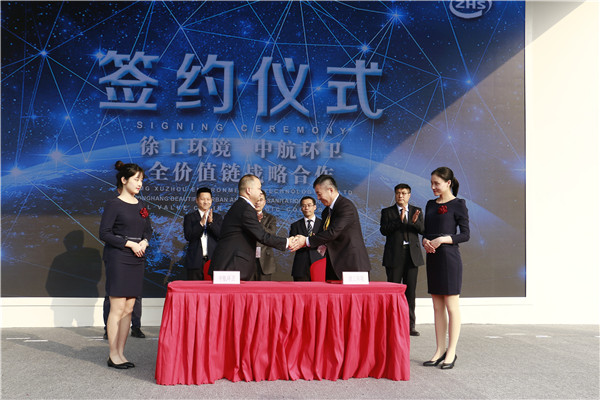 作為本次展場的重要活動之一—徐工環(huán)境和中航美麗城鄉(xiāng)環(huán)衛(wèi)集團有限公司(以下簡稱中航環(huán)衛(wèi))的全價值鏈戰(zhàn)略合作簽約儀式在27日下午如期舉行,徐工機械副總裁王慶祝,徐工環(huán)境總經(jīng)理、黨委書記劉慶東和中航環(huán)衛(wèi)董事長曹虎共同見證了這一重要歷史時刻,雙方將秉持1+1>2的深度合作理念,共同深耕于美麗中國建設(shè)。