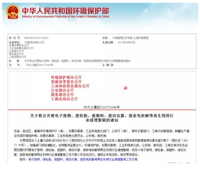 關于聯(lián)合開展電子廢物、廢輪胎、廢塑料、廢舊衣服、廢家電拆解等再生利用行業(yè)清理整頓的通知各省、自治區(qū)、直轄市環(huán)境保護廳(局)、發(fā)展改革委、工業(yè)和信息化部門、公安廳(局)、商務主管部門、工商行政管理局,新疆生產(chǎn)建設兵團環(huán)境保護局、發(fā)展改革委、工業(yè)和信息化委員會、公安局、商務局: 為貫徹落實《土壤污染防治...