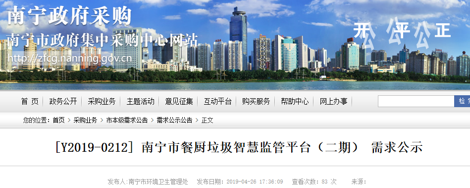 中國環(huán)聯(lián)網(wǎng)獲悉,4月26日,廣西南寧市餐廚垃圾智慧監(jiān)管平臺(二期)發(fā)布需求公示,項目預(yù)算總價572.57萬元。為保障政府采購各方當(dāng)事人的合法權(quán)益,確保政府采購公開、公平、公正。擬對南寧市餐廚垃圾智慧監(jiān)管平臺(二期) 進(jìn)行公開招標(biāo) 。現(xiàn)將采購需求進(jìn)行公示,征詢各潛在供應(yīng)商的意見。1、項目預(yù)公示編號:Y...