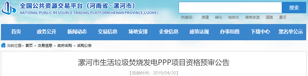 近日,河南漯河市2250噸/日生活垃圾焚燒PPP項目資格預(yù)審結(jié)果公示,經(jīng)評審小組評定,在遞交資格預(yù)審申請文件的8家申請人中,共有7家符合資格預(yù)審條件。名單如下(排名不分先后)山東省工業(yè)設(shè)備安裝集團(tuán)有限公司北京高能時代環(huán)境技術(shù)股份有限公司河南城發(fā)環(huán)境股份有限公司中電建寧夏工程有限公司協(xié)鑫智慧能源股份有...