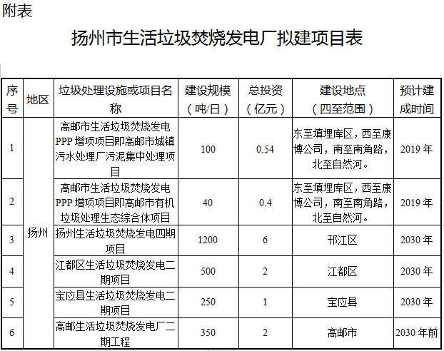 日前揚州市人民政府公示了《揚州市生活垃圾焚燒發(fā)電廠擬建項目表》,共6個項目,總投資11.94億元,具體內容如下:為貫徹國家發(fā)展改革委等五部委關于《關于進一步做好生活垃圾焚燒發(fā)電廠規(guī)劃選址工作的通知》(發(fā)改環(huán)資規(guī)〔2017〕2166號)精神,提升揚州環(huán)境質量,提高全市生活垃圾無害化處理能力和資源循環(huán)利...