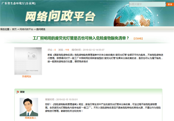 提問:新版《國家危險(xiǎn)廢物名錄》危險(xiǎn)廢物豁免管理清單中對(duì)未分類收集的“廢熒光燈管”全部環(huán)節(jié)均為豁免,不按危險(xiǎn)廢物進(jìn)行管理。那想請(qǐng)問對(duì)于一般工廠中照明用的同樣家庭型的“廢熒光燈管”如果未分類收集的話,是否也可認(rèn)為屬于豁免,按一般固體廢物進(jìn)行處置,請(qǐng)領(lǐng)導(dǎo)多指點(diǎn)。答復(fù):您好!《危險(xiǎn)廢物豁免管理清單》規(guī)定,家...