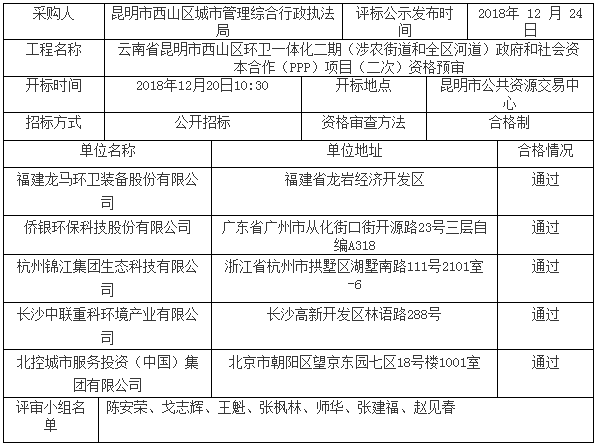 云南省昆明市西山區(qū)環(huán)衛(wèi)一體化二期(涉農(nóng)街道和全區(qū)河道)政府和社會資本合作(PPP)項目(二次)資格預審結(jié)果公示,公示顯示福建龍馬環(huán)衛(wèi)裝備股份有限公司、僑銀環(huán)??萍脊煞萦邢薰?、杭州錦江集團生態(tài)科技有限公司、長沙中聯(lián)重科環(huán)境產(chǎn)業(yè)有限公司、北控城市服務投資(中國)集團有限公司通過資格預審。具體內(nèi)容如下:...