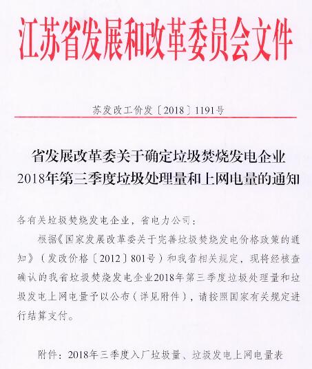 日前,江蘇發(fā)改委發(fā)布關(guān)于確定垃圾焚燒發(fā)電企業(yè)2018年第三季度垃圾處理量和上網(wǎng)電量的通知,詳情如下: