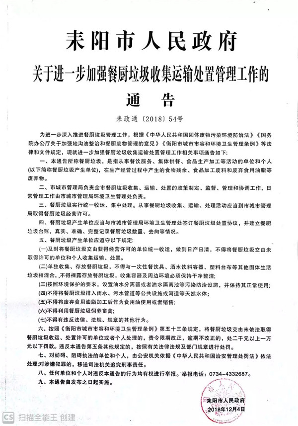 為進一步深入推進餐廚垃圾管理工作,根據(jù)《中華人民共和國固體廢物污染環(huán)境防治法》《國務(wù)院辦公廳關(guān)于加強地溝油整治和餐廚廢物管理的意見》《衡陽市城市市容和環(huán)境衛(wèi)生管理條例》等法律和文件規(guī)定,現(xiàn)就進一步加強餐廚垃圾收集運輸處置管理工作相關(guān)事項通告如下:耒陽市人民政府關(guān)于進一步加強餐廚垃圾收集運輸處置管理工...
