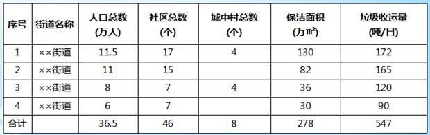 基本概述××區(qū)4個街道轄區(qū)保潔總面積278萬m2,垃圾收運量約547噸/日。××區(qū)4個街道基本概況一覽表當前運營狀況對標“創(chuàng)建全國文明城市”標準,當前××區(qū)4個街道轄區(qū)市容容貌標準不達標,具體表現(xiàn)為環(huán)衛(wèi)公司不專業(yè)、不“環(huán)衛(wèi)”亂象。如一些社區(qū)、城中村清掃保潔每日清掃一次,沒有安排保潔;城鄉(xiāng)結(jié)合部、三邊...