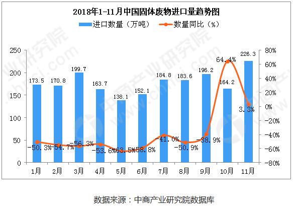據(jù)中商產(chǎn)業(yè)研究院數(shù)據(jù)庫顯示,2018年11月中國固體廢物進(jìn)口量大幅度增長,2018年11月中國固體廢物進(jìn)口量為226.3萬噸,同比增長3.3%。從金額方面來看,2018年8-10月中國固體廢物進(jìn)口金額呈下降趨勢,2018年11月中國固體廢物進(jìn)口金額有大幅度回升;2018年11月中國固體廢物進(jìn)口金額為...