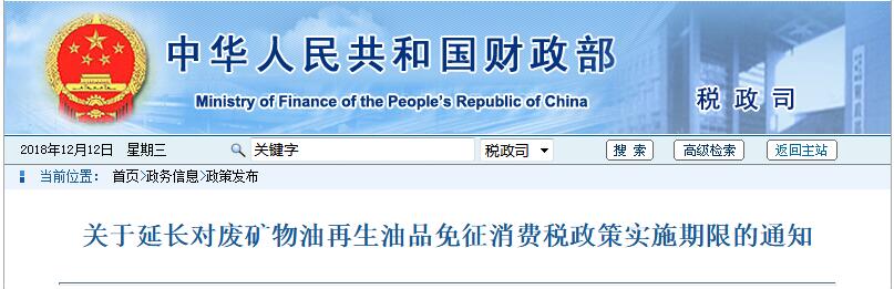 日前,財(cái)政部發(fā)布通知,《財(cái)政部 國家稅務(wù)總局關(guān)于對廢礦物油再生油品免征消費(fèi)稅的通知》(財(cái)稅〔2013〕105號)實(shí)施期限延長5年,詳情如下:財(cái)稅〔2018〕144號各省、自治區(qū)、直轄市、計(jì)劃單列市財(cái)政廳(局),國家稅務(wù)總局各省、自治區(qū)、直轄市、計(jì)劃單列市稅務(wù)局,新疆生產(chǎn)建設(shè)兵團(tuán)財(cái)政局:為進(jìn)一步促進(jìn)資...