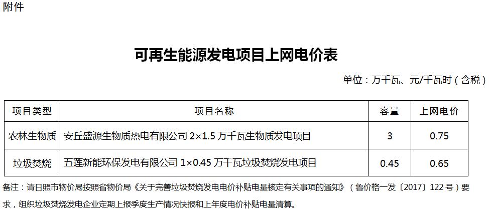 山東省發(fā)展和改革委員會關(guān)于安丘盛源生物質(zhì)熱電有限公司等可再生能源發(fā)電項(xiàng)目上網(wǎng)電價(jià)的批復(fù)魯發(fā)改價(jià)格〔2018〕1294號濰坊、日照市物價(jià)局:你們《關(guān)于核定安丘盛源生物質(zhì)熱電有限公司生物質(zhì)發(fā)電項(xiàng)目上網(wǎng)電價(jià)的請示》(濰價(jià)辦發(fā)〔2018〕44號)、《關(guān)于五蓮新能環(huán)保發(fā)電有限公司上網(wǎng)電價(jià)的請示》(日價(jià)格發(fā)〔2...